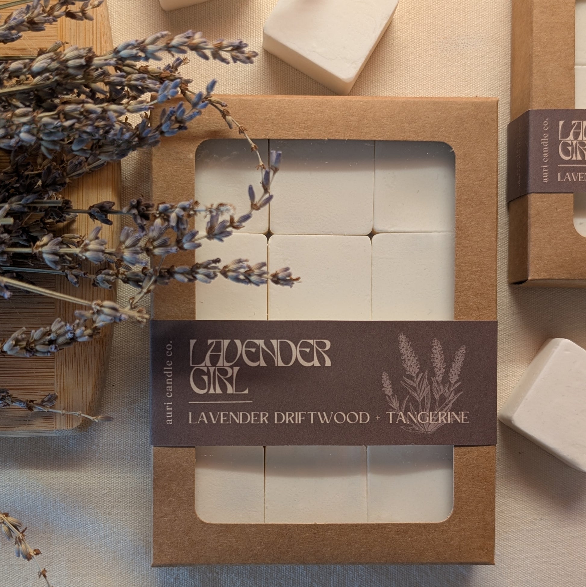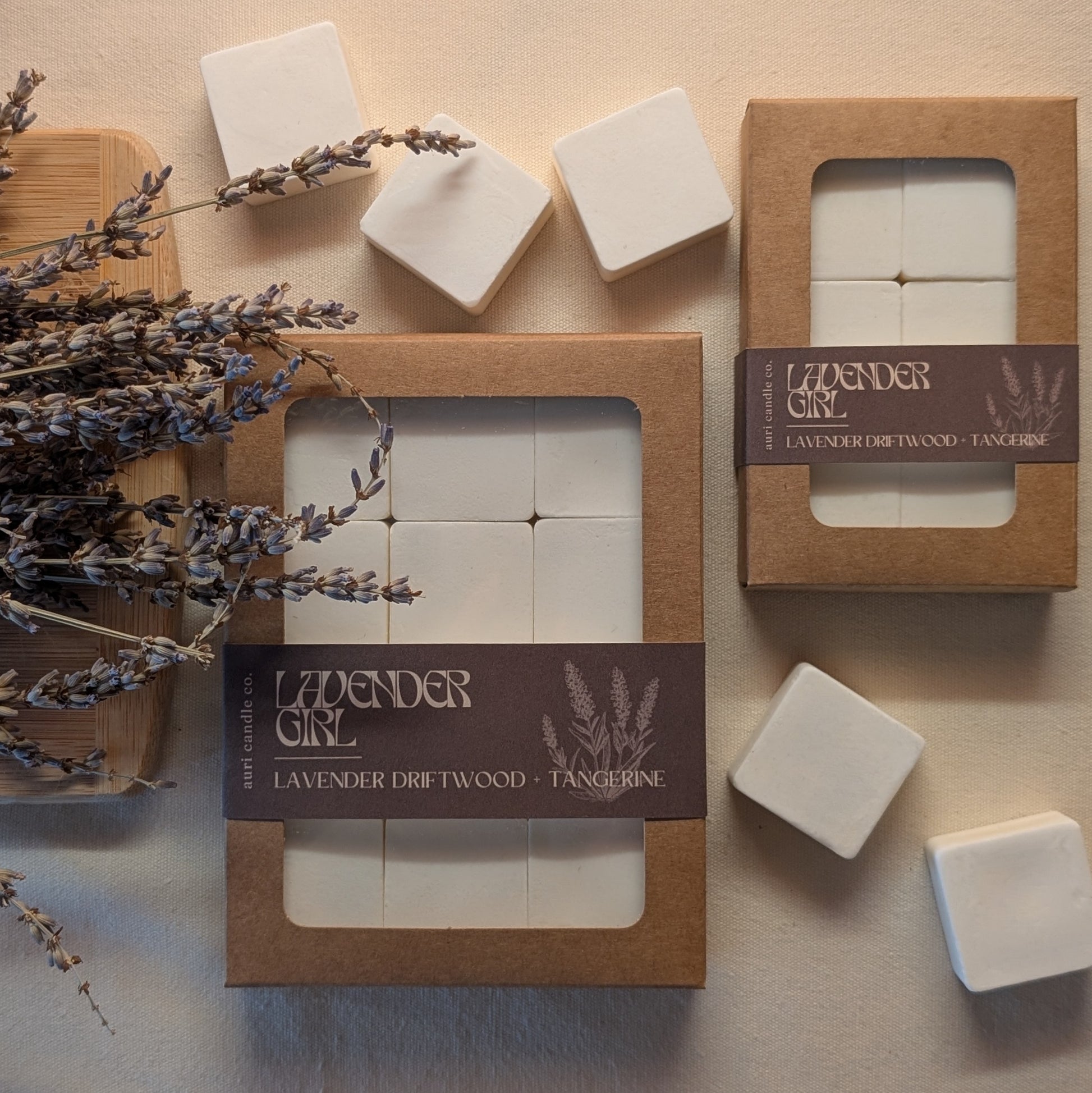 Lavender Girl is a unique take on a timeless floral, capturing the calming essence of lavender with the sweet brightness of tangerine, grounded by warm, woodsy driftwood. This hand-poured coconut soy wax melt offers a soothing yet sophisticated aroma, featuring: